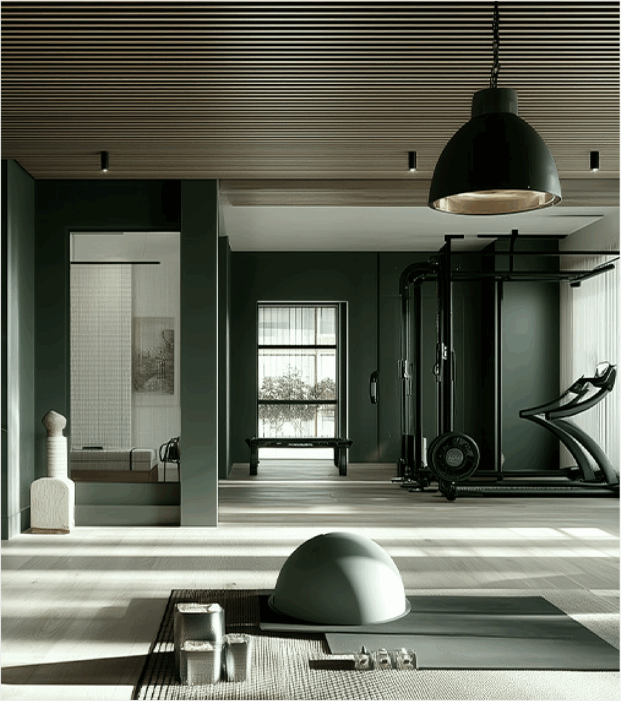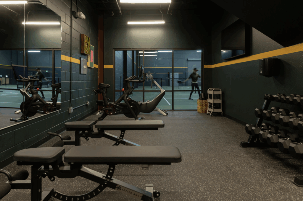The fitness studio at Pickle Athletics features high-performance cardio machines, a rack + cable station, and all the essentials (Peloton, Hydrow, squat rack, etc.)